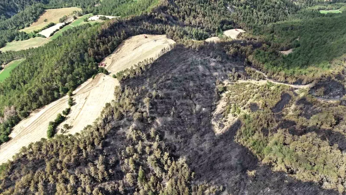 Bolu’nun Göynük ilçesinde ormanlık alanda çıkan yangında kül olan 25 hektarlık bölge havadan dron ile görüntülendi.