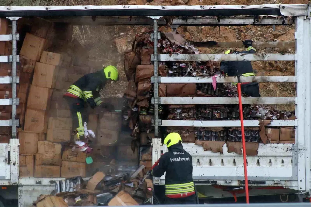 TEM Otoyolu’nun Bolu geçişinde züccaciye eseri yüklü kamyonun dorsesinde çıkan yangın gruplarca söndürüldü.